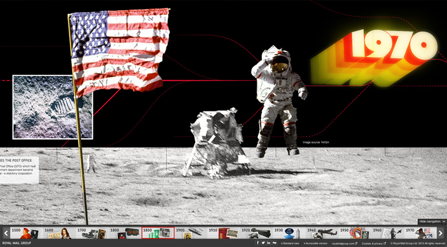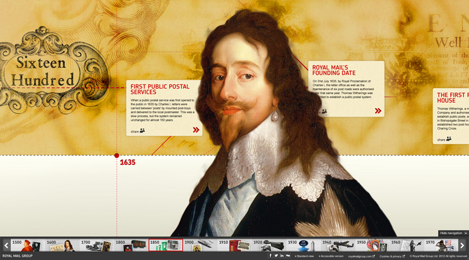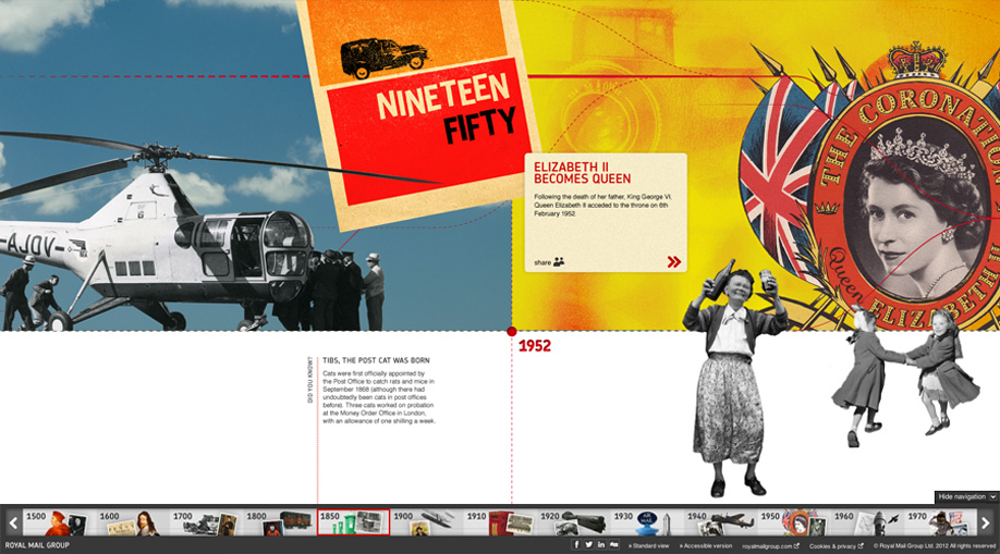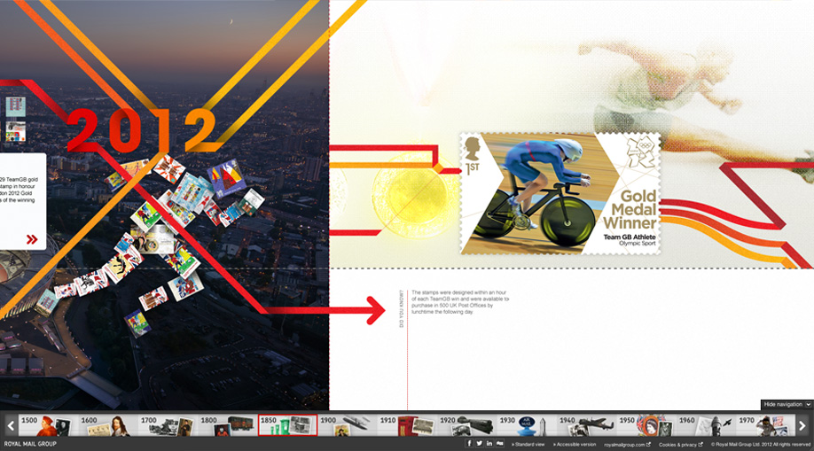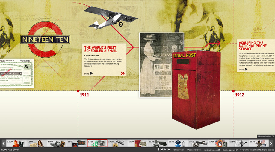 ROLES Our new website for Royal Mail filled was filled with beautifully smooth and intuitive functionality. But how could the site communicate our client’s remarkable culture of innovation in an equally engaging way? We created a rich, interactive timeline, meticulously researched and offering multiple layers of content using animation, video and audio narrative. We selected an advanced parallax technology called ‘in-parallax’ as the ideal platform to show off this multimedia experience. This has proved highly successful and the user is taken on an intriguing journey from the early 1500s through to the 2012 Olympics, with ample opportunities to stop off along the way. |